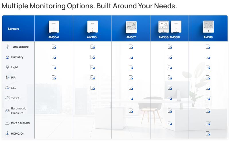 The AM300 series is designed to monitor indoor air quality (IAQ) and comfort parameters across a wide range of environments. By combining multiple sensors in one device, it provides direct insight into air quality, occupancy, and environmental conditions.
